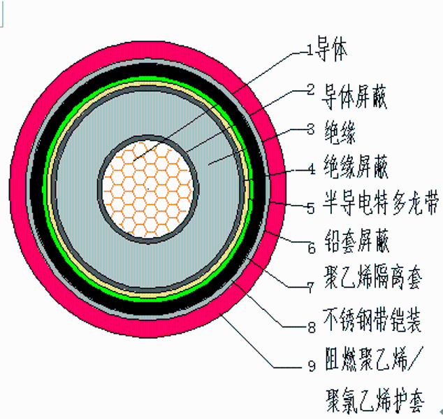 (1)该产品性能满足海底隧道的复杂地理环境要求,具有海缆防水防腐特性。采用挤包铅套防腐层和聚乙烯隔离层,聚乙烯隔离层起到了防海水的作用,铅套防腐层能有效防止海水腐蚀。